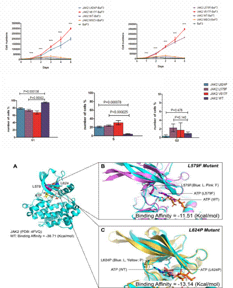 本研究我们通过选取L579F和L624P突变证实JAK2 外显子13和15区域发生的突变能够产生同JAK2V617F一样的细胞增殖效应。晶体结构及蛋白分子动力学模拟显示,L579F和L624P均可造成JAK2蛋白空间构象的改变,但此两突变是通过干扰JAK2蛋白与其底物ATP的结合能力导致JH2蛋白结构域失去对JH1结构域的抑制效应;而JAK2V617F则是通过降低JH2结构域αC结构Tm值,改变其稳定性,导致所在JH2区蛋白结构域失去对JH1结构域的抑制效应,进而诱发JAK2自主活化,产生自主促细胞增殖作用。该结果提示尽管JAK2 外显子13和15区域发生的突变与JAK2V617F突变对JH2结构域产生不稳定的机制略有不同,但最终效果均是引起JH2区蛋白结构域失去对JH1结构域的抑制效应。该研究已发表于International Jounal of Labrratory Hematology杂志。