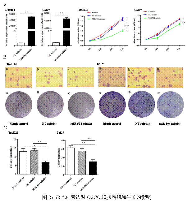 在人类OSCC细胞系Cal27与Tca8113中,通过脂质体转染技术过表达OSCC细胞中的miR-504。结果显示miR-504过表达能够显著抑制OSCC细胞的增殖、生长、迁移和侵袭,但对OSCC细胞凋亡无明显影响(图2、图3、图4)。