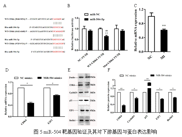 生物信息学软件预测CDK6为OSCC中miR-504的潜在靶标。双荧光素酶报告实验证实CDK6为miR-504的直接靶标,且miR-504与CDK6的表达呈负相关。miR-504过表达可显著抑制OSCC细胞中细胞周期相关蛋白E2F1与CyclinD1表达,促进p21蛋白表达。同时,miR-504过表达还可抑制OSCC细胞中细胞自噬标志基因Beclin1蛋白表达(图5)。