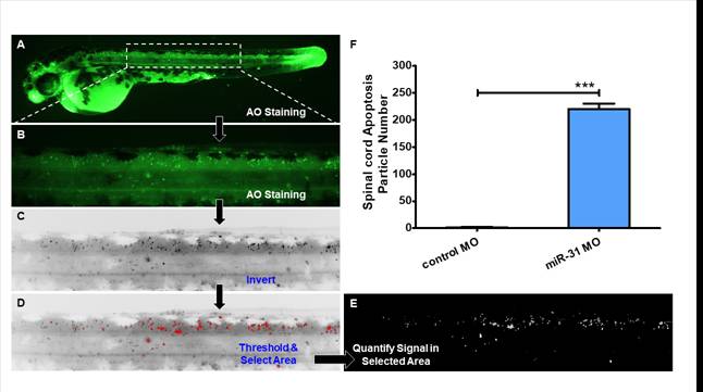 为了验证MNs缺失是否由凋亡引起,我们使用AO评估斑马鱼在26 hpf时的细胞凋亡情况。对照组与miR-31 MO组比较发现,对照组中仅有少量凋亡颗粒,而miR-31 MO组则有大量凋亡颗粒沿中枢神经系统脊索呈线性分布。此外,侧区凋亡颗粒相对较脊索部小。Image J定量分析了miR-31 MO与对照组的凋亡颗粒数量,发现miR-31 MO的平均凋亡颗粒数量为125.9个,而对照组为5个,差异为25倍。这些结果表明,miR-31敲降后,斑马鱼的脊髓部位在神经元缺失的情况下,同时出现大量细胞凋亡,侧索未形成,斑马鱼失去运动功能。