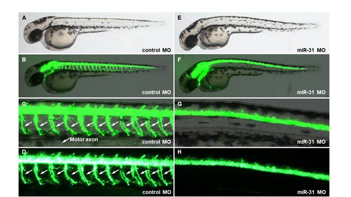 图1-1 Morpholino敲降miR-31表达后导致斑马鱼MNs发育异常。