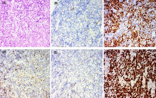 注:A. H&E染色B. CD10表达(-)C. Bcl-6表达(+)D. 30%MUM1表达(+)E. 10%Bcl-2表达(+)F. Ki67呈弥漫性强(+)