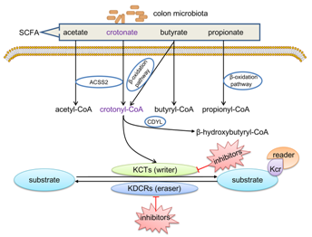 蛋白质的巴豆酰化是一种新发现的翻译后修饰(PTMs),它多发生在蛋白质的赖氨酸残基,即赖氨酸巴豆酰化(Kcr)。Kcr是保守的,受一系列酶和辅酶包括赖氨酸巴豆酰转移酶(写入者)、赖氨酸脱巴豆酰化酶(擦除者)、某些叶芝蛋白(阅读器)、和巴豆酰辅酶A(供体)的调控。组蛋白Kcr自2011年以来已经被大量研究,但直到2017年非组蛋白Kcr才被发现,是一个新兴领域。组蛋白和非组蛋白的赖氨酸巴豆酰转移酶和赖氨酸脱巴豆酰化酶并不完全一致。