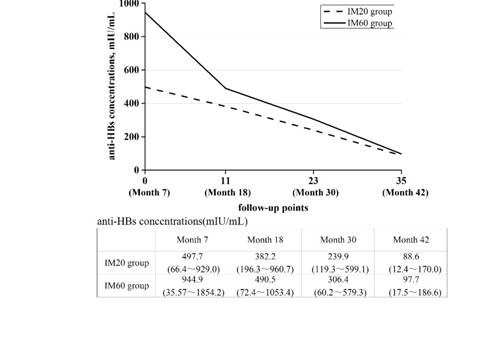 本研究发现100名MMT患者在全程接种后7-42月的随访中,20μg组和60μg组抗-HBs几何平均浓度动力学曲线相似,抗-HBs几何平均浓度在第一年里急剧下降,随后下降速度趋于平缓,最终两组的抗-HBs水平逐渐接近。20μg组患者的阳性率从78.0%(39/50)降至31.1%(14/45),60μg组患者的阳性率从86.0%(43/50)降至50.0%(20/40);20μg组抗-HBs从497.7 mIU/mL降至88.6 mIU/mL,60μg组抗-HBs从944.9 mIU/mL降至97.7 mIU/mL。在不同随访时点60μg组免疫效果均高于20μg组,但未见统计学差异。