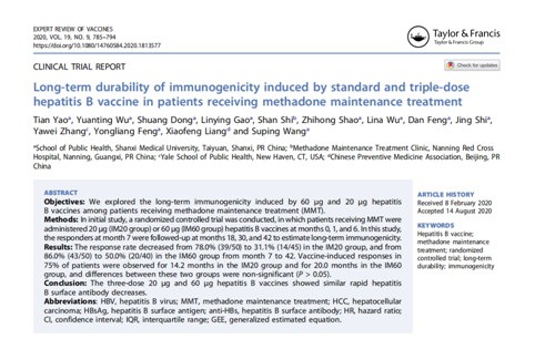 2020年8月免疫学领域权威期刊Expert Review of Vaccines(IF=4.362 , Ranking: 39/297 )在线发表了万象城allwincity官网公共卫生学院王素萍教授团队题为“Long-term durability of immunogenicity induced by standard and triple-dose hepatitis B vaccine in patients receiving methadone maintenance treatment”的研究报告。该研究采用多中心、双盲临床试验研究设计,基于广西壮族自治区南宁市红十字会医院所征集的118例美沙酮维持治疗(MMT)患者按照不同方案接种乙肝疫苗后长达3年的随访,对该人群进行了乙肝表面抗体(抗-HBs)的动态观察,获得广西壮族自治区MMT患者不同方案乙肝疫苗接种后的免疫效果及持久性的证据,为制定高危人群乙肝疫苗接种指南提供科学依据。