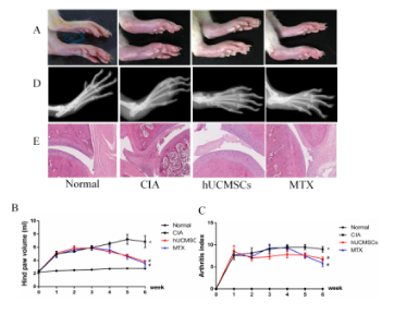 1. hUCMSCs可有效改善CIA大鼠后足肿胀度及关节炎指数,延缓CIA大鼠关节炎放射学进展,减少CIA大鼠关节滑膜增生及炎性细胞浸润,作用与治疗RA的经典药物甲氨蝶呤(MTX)相似。