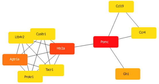 在本研究中,课题组采用大鼠基因芯片技术筛选经京尼平苷处理的β细胞中差异分子,鉴定了308个差异lncRNA和128个差异 mRNA。GO和KEGG通路富集分析显示,差异基因主要参与了G蛋白偶联受体信号通路、炎症反应、钙信号通路、细胞增殖的正调控、ERK1和ERK2级联反应等。利用STRING数据库和Cytoscape插件CytoHubba筛选得到Pomc、Htr2a和Agtr1a三个hub mRNA。SwissTargetPrediction数据库进一步验证了这一结果。根据基因表达水平的Pearson系数确定了7个lncRNA (NONRATT027738、NONRATT027888、NONRATT030038等)与3个hub mRNA (Pomc、Htr2a和Agtr1a)共表达。这些lncRNA通过ceRNA机制与6个miRNA (rno-miR-5132-3p、rno-miR-344g、rno-miR-3075等)竞争,从而调控hub mRNA功能。进一步分析表明,lncRNA NONRATT027738与三个hub mRNA均相互作用,表明其在ceRNA网络中处于核心位置。