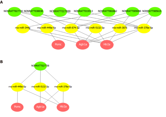 图3. 构建关键lncRNA与Pomc、Htr2a和Agtr1a 的ceRNA网络