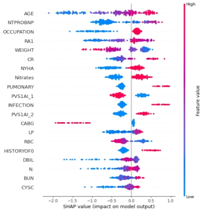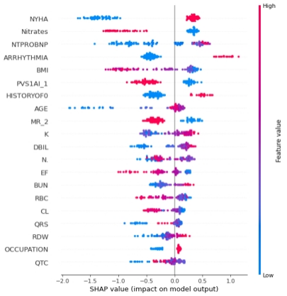 在本研究中,作者开发并测试了一种可解释的基于机器学习(machine learning,ML)的风险分层工具,以预测冠心病引起的心衰患者在3年随访期间的全因死亡率。在6种ML分类器中,XGBoost的性能最好,因此,作者使用该模型来创建ML风险评分。研究发现该风险评分模型明显优于目前可用的其他风险评分。最终结果表明,ML具有临床应用的潜力,以改善风险评估。同时,作者利用SHAP值和SHAP图证明了ML方法可以说明冠心病心衰患者的关键特征,建立高精度的死亡率预测模型。特征重要性的说明和特征重要性的可视化解释可以让医生直观地理解XGBoost中的关键特征,帮助医生更好地理解模型的决策过程,结果中描述的详细信息和对于风险因素的解释让医生更有洞察力,可以帮助他们做出更明智的决定,而不是一味盲目地相信算法的结果。