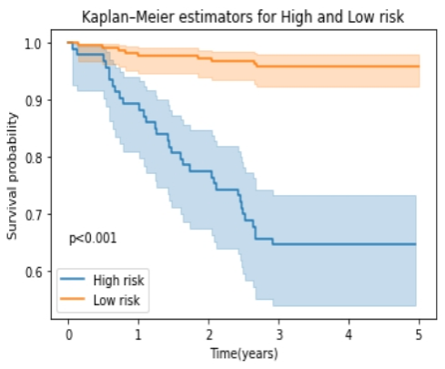 Figure1Categorization threshold of Prediction score(A)andKaplan–Meier estimator for populationwith low and high machine learning risk (B).