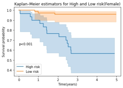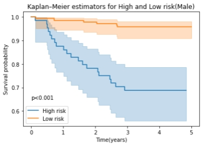Figure3Variable importance in ML classification for men (A,N= 1023) and women (B,N= 539). Kaplan–Meier curves for subjects with highand low ML risk in mam (C) and woman (D).