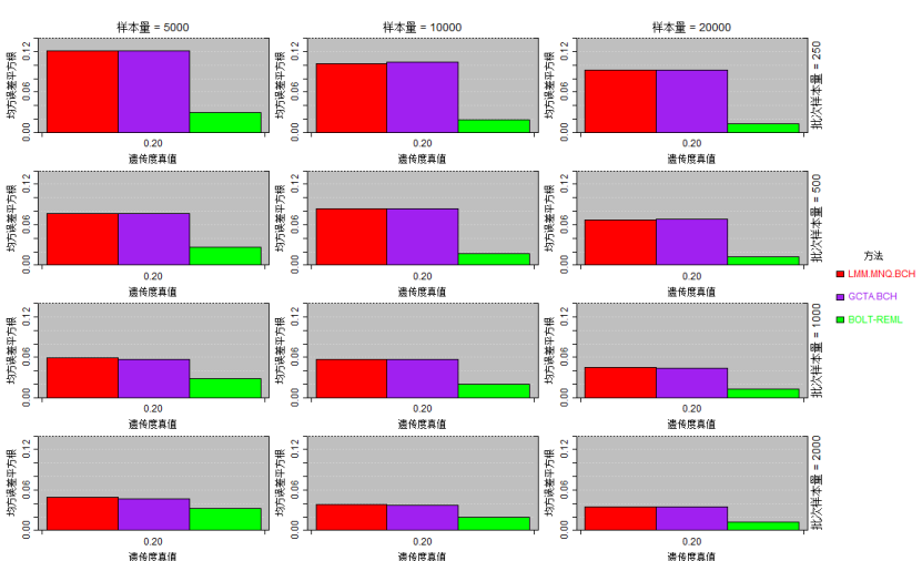 对于非分批处理法,无论是单方差还是多方差分析,LMM.MNQ是无偏的遗传度估计方法,且随着样本量的增加,估计越精确。对于分批处理法,无论单方差还是多方差分析,LMM.MNQ.BCH是无偏的估计方法,随着批次样本量和批次数目的增加,LMM.MNQ.BCH估计越精确。分批处理法是普遍适用的方法,可用于那些能给出无偏遗传度估计的方法来减少计算负担。对于计算时间,模拟和实例研究表明,LMM.MNQ.BCH的估计结果和现有的方法BOLT-REML估计的结果相近,但是明显快于后者。