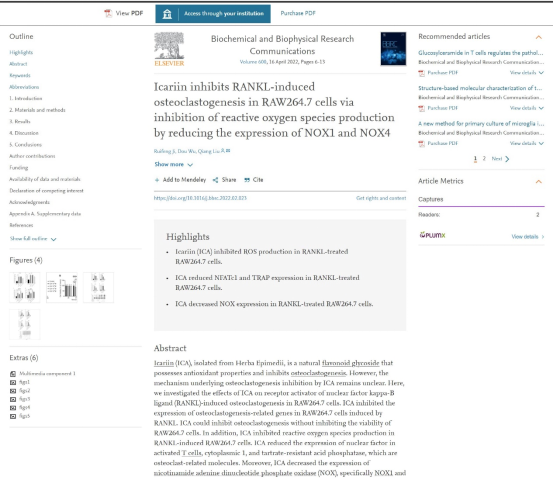 研究成果发表在国际期刊《Biochemical and Biophysical Research Communications》上,文章题目为“Icariin inhibits RANKL-induced osteoclastogenesis in RAW264.7 cells via inhibition of reactive oxygen species production by reducing the expression of NOX1 and NOX4”。