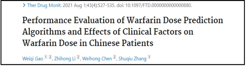2021年8月7日万象城allwincity官网药学院临床药学教研室张淑秋教授课题组在Therapeutic Drug Monitoring杂志上发表题为“Performance Evaluation of Warfarin Dose Prediction Algorithms and Effects of Clinical Factors on Warfarin Dose in Chinese Patients”的论文,第一作者为2018级博士生高伟祺,通讯作者张淑秋。该研究对比分析了六种已发表的主要华法林剂量预测模型[1-6]对本地人群的预测性能及各临床因素对华法林剂量的影响。