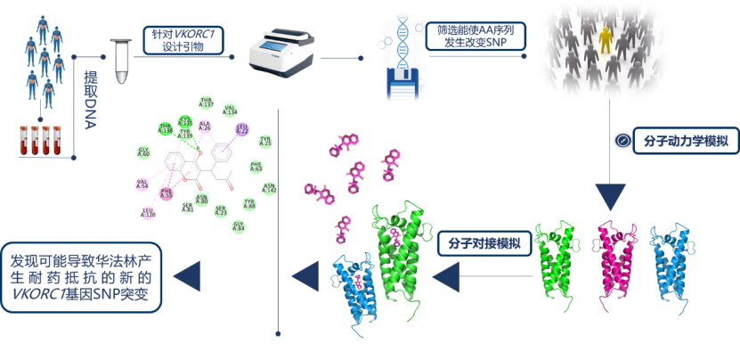 图3.VKORC1基因外显子区SNP筛查及VKORC1与华法林相互作用模拟研究示意图