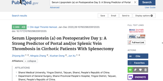 术后第3天的血清脂蛋白(a):是肝硬化患者脾切除术后门静脉和/或脾静脉血栓形成的有力预测因素——徐钧课题组研究成果在权威学术期刊发表