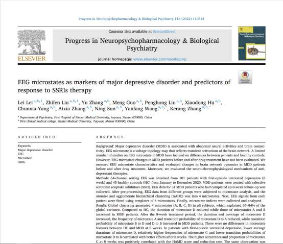 基于以上研究背景,本研究通过静息态脑电微状态分析方法探索首发重性抑郁障碍患者神经电生理特征及评估SSRIs抗抑郁治疗前后脑网络动力学的变化,以期找到抑郁障碍生物学特征指标及疗效预测指标。相关研究成果发表在Progress in neuro-psychopharmacology & biological psychiatry 2022,116:110514题为“EEG microstates as markers of major depressive disorder and predictors of response to SSRIs therapy”第一单位为万象城allwincity官网第一医院。
