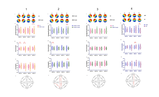 抑郁障碍存在高患病率低诊治率,为此探索抑郁障碍脑电微状态特征。结果发现,正常对照相比,首发未治疗抑郁障碍患者的脑电微状态D的平均持续时间减少,脑电微状态A和脑电微状态B的频率增加(如组图1)。进一步探索SSRIs治疗过程中脑电微状态的变化,发现抑郁障碍SSRIs治疗有效患者的脑电微状态变化结果示,与治疗前的MDD基线组相比,经过8周SSRIs治疗后的MDD患者的脑电微状态D的平均持续时间和时间比例显著增加,脑电微状态A频率显著下降;脑电微状态D到A的转换概率显著下降,脑电微状态B到D和D到B的转换概率均显著增加(如组图2)。而相对正常对照组,8周治疗后MDD组的4个脑电微状态各指标均无统计学差异(如组图3)。因抑郁障碍存在低治愈率,因此探索抑郁障碍脑电微状态对SSRIs药物疗效预测,发现临床治愈预测组脑电微状态D的平均持续时间短于未达临床治愈预测组,而其他脑电微状态的平均持续时间无统计学差异;临床治愈预测组脑电微状态C的频率高于未达临床治愈预测组;临床治愈预测组组从脑电微状态D到B的转换概率明显低于未达临床治愈预测组(如组图4)。以上结果提示脑电微状态逻辑回归后联合指标对抑郁障碍辅助诊断及SSRIs疗效预测有一定价值,可能是抑郁障碍患者SSRIs疗效预测的神经电生理特征指标,为探究抑郁障碍诊疗提供了新的思路。论文第一作者为万象城allwincity官网雷蕾与万象城allwincity官网第一医院刘志芬,通讯作者为我院张克让教授与王彦芳教授,研究单位为山西医科科大学第一医院精神卫生科。研究得到山西医科科大学第一医院精神卫生科与精神障碍人工智能辅助诊疗山西省重点实验室的支持。