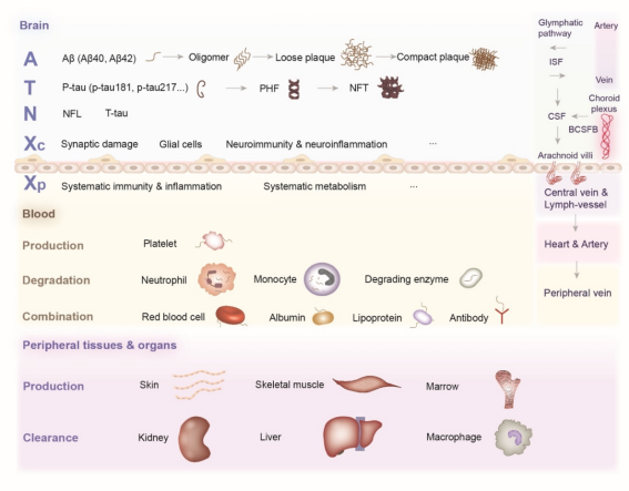 “X”指神经免疫失调、突触功能障碍和BBB改变等其他AD可能发病机制中涉及的生物标志物,在A/T/N框架中加入“X”能够更加全面反映AD病理变化,阐明AD的发病机制。我们将“X”分为两部分,分别是中枢X(XC),即与突触损伤、神经胶质细胞、神经炎症和免疫等相关的生物标记物,和外周X(XP),即与系统免疫、炎症和新陈代谢等相关的生物标记物。
