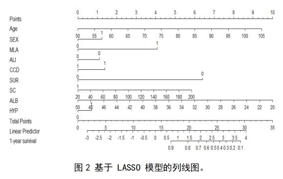 注:S0= 0.984(1年基线生存率)。“-”表示该变量在LASSO收缩过程中被移除。脆性髋部骨折患者骨折后1 年内的预测生存概率计算公式为p=0.984exp (0.042*Age+0.305*SEX+MLA-0.272*ALI+0.343*CCD-1.573*SUR+0.008*SC-0.082*ALB+0.171*HYP),对应的死亡率为1-p。