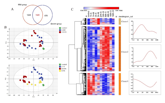 注: A 轻度和重度挫伤组间DEGs的Venn图;B轻度和重度挫伤组1620个共有基因的PCA结果C所有DEGs基于层次聚类的热图(左:-M和-S分别表示轻度和重度损伤),以及每个基因簇根据伤口年龄的平均表达(右)