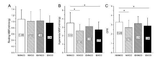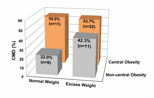 共有128名非阻塞性冠心病患者参与此项研究。依据BMI和腰围将入组患者分为四组:正常对照组(BMI与腰围均正常,n=41),单纯腹型肥胖组(BMI正常但腰围异常,n=20),单纯高BMI组(BMI异常但腰围正常,n=26),腹型肥胖合并高BMI组(BMI与腰围均异常,n=41)。所有入组患者均行一日法静息+腺苷负荷13N-NH3 PET 心肌灌注显像,使用Heartsee软件获得心肌血流量(myocardial blood flow, MBF)和心肌血流储备(myocardial flow reserve, MFR)。本结果发现腹型肥胖与较低的负荷MBF和MFR以及较高的CMD患病率有关,其中,单纯腹型肥胖患者的负荷MBF和MFR最低,CMD发生率最高(图1和图2)。此外,我们发现腰围是CMD的独立危险因素,而非BMI。因此,我们认为在非阻塞性冠心病患者中,腹型肥胖尤其是体重正常的腹型肥胖患者更易患CMD。相反,在没有腹型肥胖的情况下,超重或肥胖并不会导致CMD风险升高。因此,腰围与BMI相结合可以更好地对非阻塞性冠心病患者进