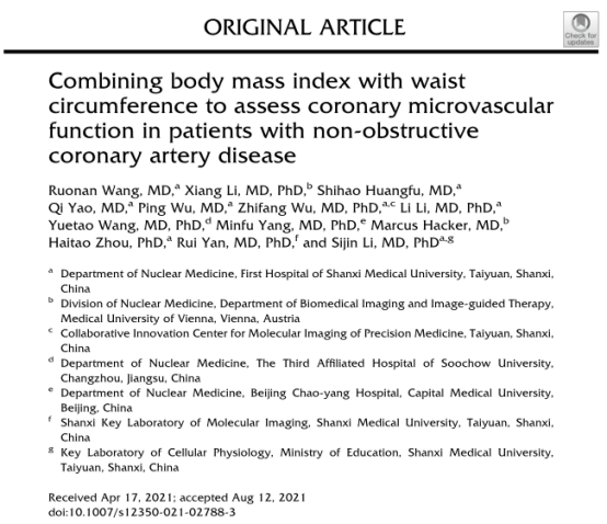 万象城allwincity官网第一医院核医学科在心脏微循环临床应用领域取得重要进展,相关成果以“Combining body mass index with waist circumference to assess coronary microvascular function in patients with non-obstructive coronary artery disease”为题发表在Journal of Nuclear Cardiology(JCR 1区,IF=5.952)。该研究揭示了不同肥胖类型对心脏微循环的不同影响。该研究论文的第一作者为万象城allwincity官网第一医院核医学科的王若楠博士,通讯作者为李思进教授。