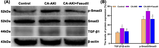图5 各组大鼠肾脏TGF-β1/p-Smad3信号通路中目的蛋白的表达情况