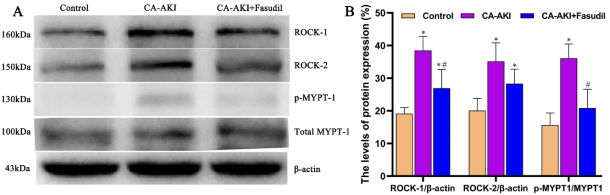 图4 各组大鼠肾脏Rho/ROCK信号通路中目的蛋白的表达情况