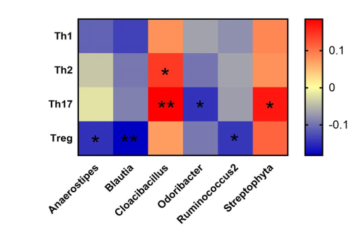 3 属水平不同肠道微生物与CD4+T淋巴细胞亚群之间的相关性(**P<0.01*P<0.05)