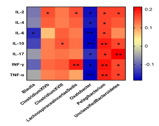 4 属水平不同肠道微生物和细胞因子之间的相关性(**P<0.01*P<0.05)