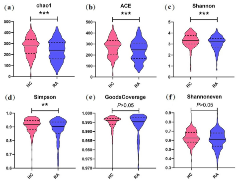 1 α多样性分析表明健康对照组和RA组之间存在显著差异(***P<0.001, **P<0.01)