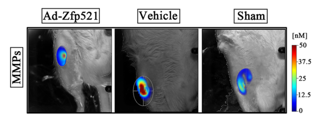 图2. 荧光分子断层扫描活体水平证实Zfp521有效降低大鼠膝关节炎症水平。
