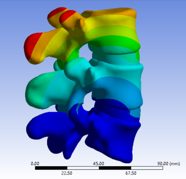 1、正常有限元模型(M0)L3-4节段在前屈、后伸、左屈、右屈、左旋、右旋的活动度为4.12°、3.2°、3.04°、3.02°、3.23°、3.38°;L4-5节段在前屈、后伸、左屈、右屈、左旋、右旋的活动度为4.46°、3.42°、3.36°、3.76°,4.35°,4.26°。与文献比较,模型中各节段不同状态活动度数据均在正常范围之内,证明该模型基本符合人体实验,可用于有限元相关研究。