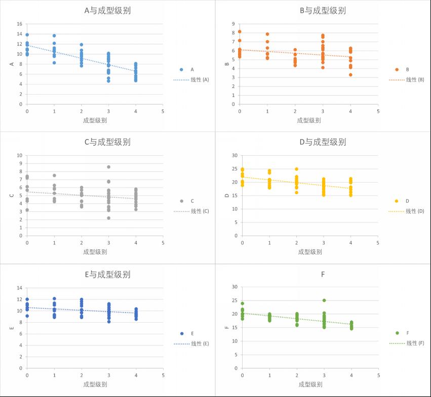 图 9 A-F与成型级别散点图