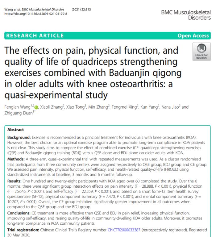 2021年5月,汪凤兰/段志光课题组在BMC Musculoskeletal Disorders杂志发表了题为The effects on pain, physical function, and quality of life of quadriceps strengthening exercises combined with Baduanjin qigong in older adults with knee osteoarthritis- a quasi-experimental study”的研究论文,该研究通过比较股四头肌肌力训练与传统八段锦气功(CE)相结合的锻炼方式与单独进行股四头肌肌力训练的锻炼方式(QSE)和单独进行八段锦练习的锻炼方式(BDJ)对KOA患者膝关节疼痛、身体功能、自我效能和健康相关生活质量的影响,旨在选择一种简单有效的并且迎合老年人偏好的锻炼方式,以达到提高KOA患者的运动依从性,从而改善其健康结局。