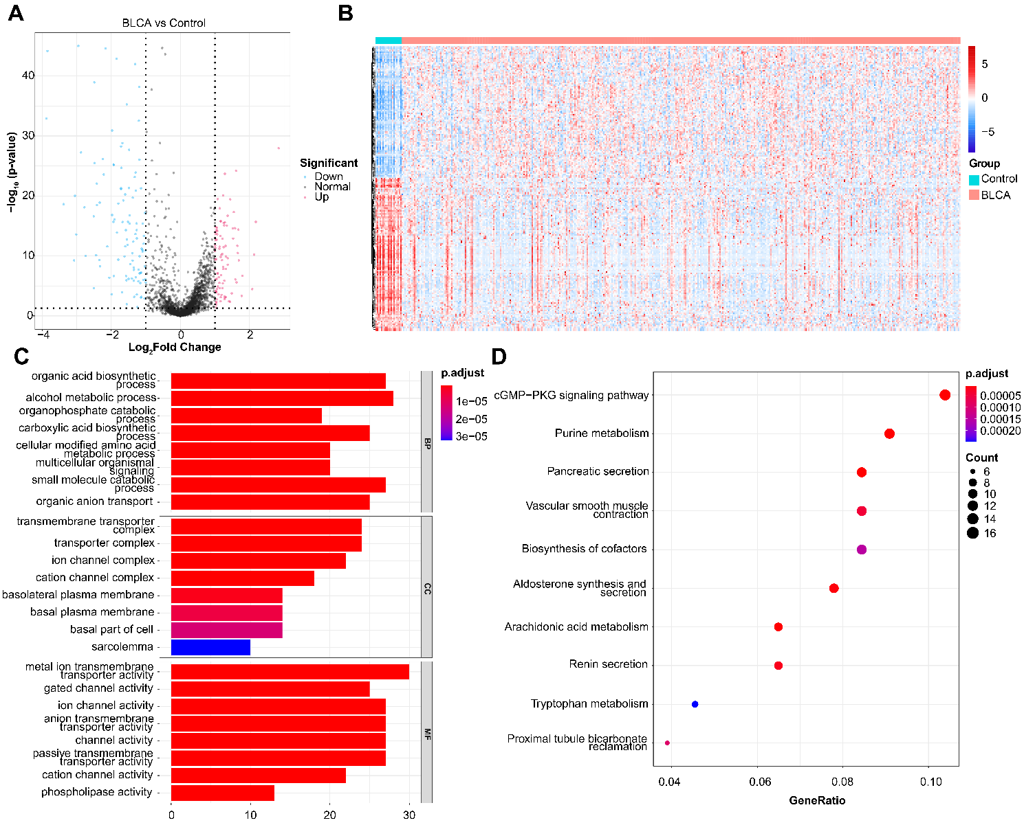 本研究基于TCGA数据库筛选到201个差异表达代谢相关基因(DEMRGs),其中93个代谢相关基因表达上调,108个代谢相关基因表达下调。功能富集分析得到477个GO BP,47个GO CC,178个GO MF,包括酒精代谢过程、细胞修饰氨基酸代谢过程、跨膜转运体复合物、转运体复合物、金属离子跨膜转运体活性、离子通道活性等。富集到226条KEGG通路,包括cGMP-PKG信号通路、嘌呤代谢、胰腺分泌、花生四烯酸代谢、色氨酸代谢等。(图1)