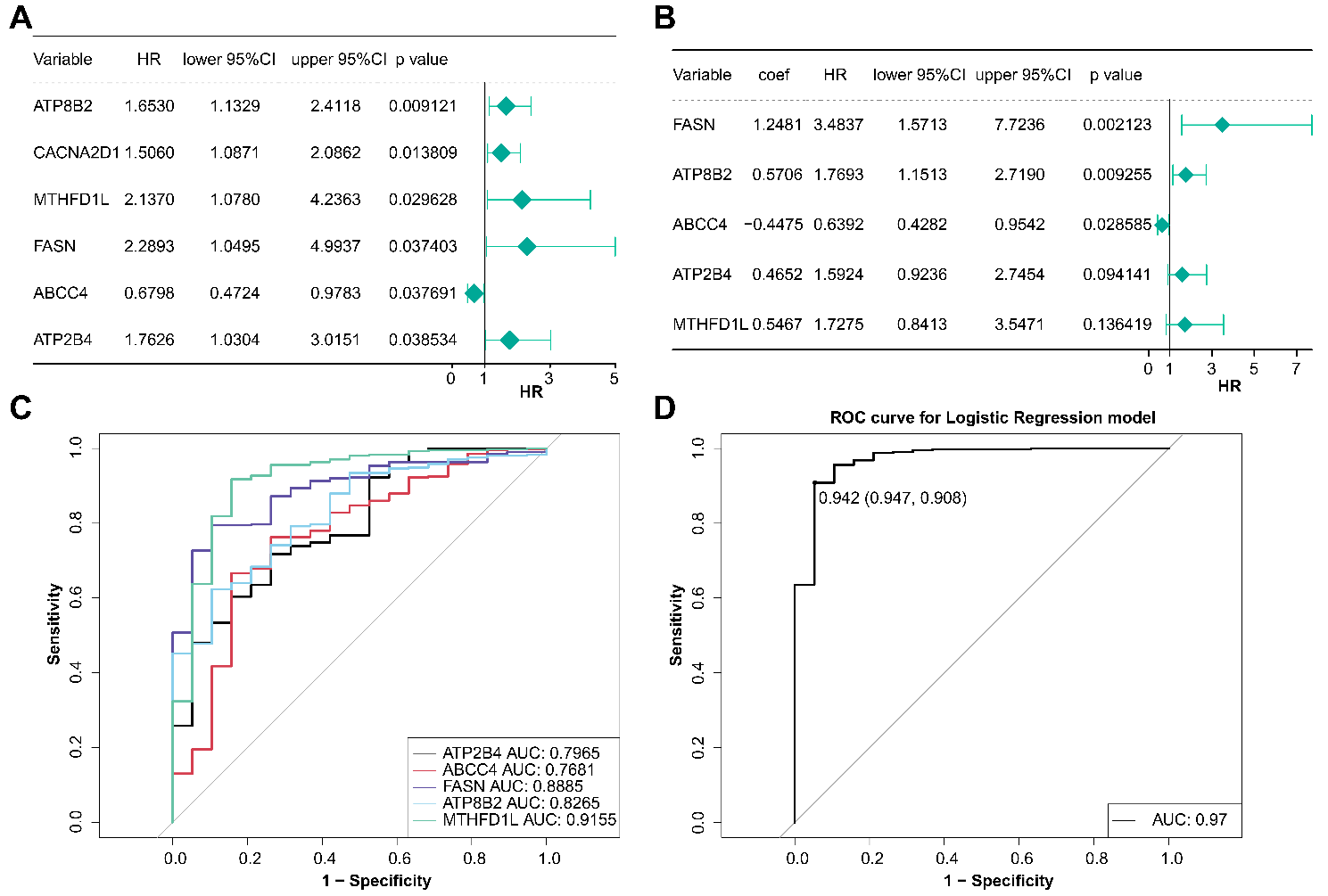 本研究采用qRT-PCR进一步验证了10例患者的生物标志物(ABCC4、FASN、FASN、ATP2B4、ATP8B2、MTHFD1L)在正常对照组和癌组织中的表达水平。qRT-PCR分析结果显示,这些基因的表达水平存在显著性差异。癌组织中FASN和MTHFD1L的mRNA水平显著升高,而ABCC4、ATP2B4和ATP8B2的mRNA水平显著降低。(图7)