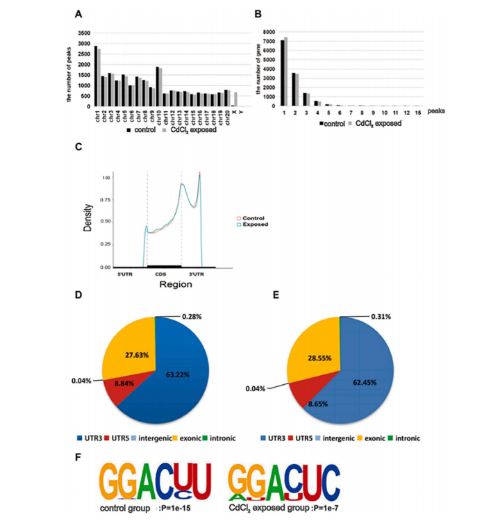 通过甲基化RNA免疫共沉淀测序(MeRIP-seq)分析氯化镉(2.0 mg/kg)处理组和对照组中转录组范围内的 m6A 甲基化图谱,见图 3。