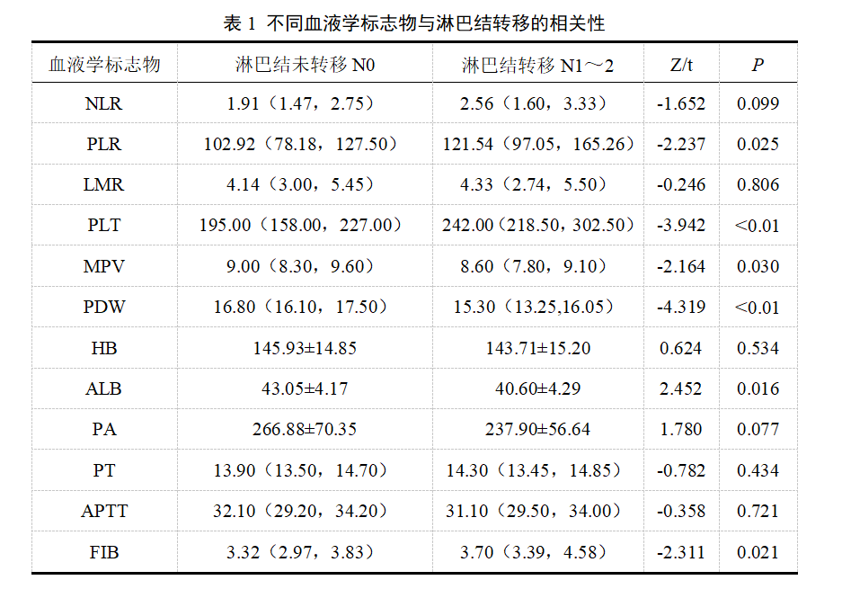 淋巴结转移组术前PLRPLTFIB均高于未转移组,MPVPDWALB均低于未转移组,差异有统计学意义(P<0.05);高PLT组淋巴结转移率高于低PLT组,低MPV组淋巴结转移率高于高MPV组,低PDW组淋巴结转移率高于高PDW组,低ALB组淋巴结转移率高于高ALB组,高FIB组淋巴结转移率高于低FIB组,差异有统计学意义(P<0.05