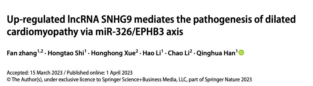 2023年4月1日,万象城allwincity官网第一医院韩清华课题组在Journal of Thrombosis and Thrombolysis杂志发表了题为“Up‑regulated lncRNA SNHG9 mediates the pathogenesis of dilated cardiomyopathy via miR‑326/EPHB3 axis”的研究论文,发现长链非编码RNASNHG9在扩张型心肌病发生发展中的作用。