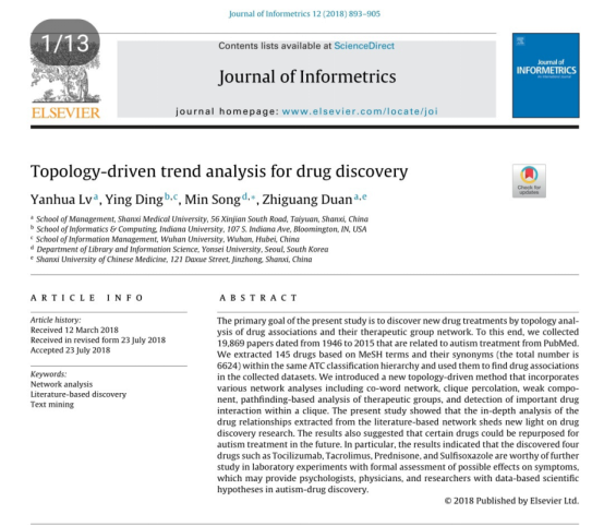 2018年8月,国际《情报计量学》杂志(Journal of Infometrics, IF=3.484)上发表了段志光教授课题组的题为“Topology-driven trend analysis for drug discovery”(基于网络拓扑驱动的药物新价值发现)的研究成果。课题组博士生吕艳华为该论文第一作者。