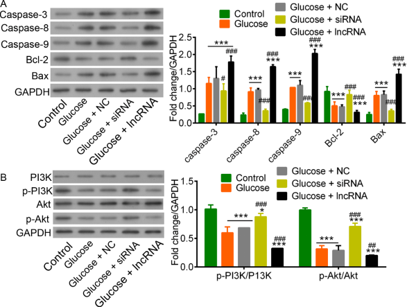 图6.Western印迹分析.A,凋亡相关蛋白的倍数变化,B,PI3K / Akt途径蛋白的倍数变化。*和***分别与对照相比p <0.05和p <0.001。相对于葡萄糖处理,#,##和###注意到p <0.05,p <0.01和p <0.001。