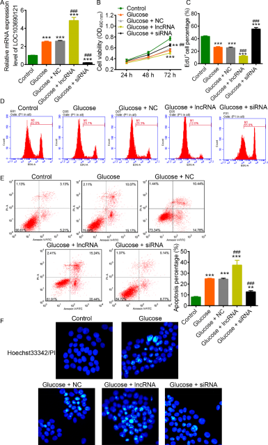 图5.LOC103690121促进葡萄糖诱导的神经元凋亡A,LOC103690121相对表达水平,C和D细胞存活率分析,EdU阳性细胞百分比,E,流式细胞仪检测细胞凋亡,F,hoechst33342 / PI双染(放大倍数×200)。**和***分别与对照相比p <0.01,p <0.001。###注意到与葡萄糖处理相比p <0.001。