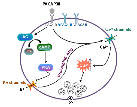 在本研究中,章毅课题组发现PACAP促大鼠胰岛素分泌具有浓度依赖性和葡萄糖依赖性,且在低糖刺激下PACAP对大鼠胰岛素分泌无影响,因此PACAP在降低高血糖时不易诱发低血糖风险。PACAP促大鼠胰岛素分泌主要通过PAC1受体,而不是VPAC1,VPAC2受体;PACAP主要通过结合PAC1受体,激活AC/PKA信号通路,抑制Kv通道,延长动作电位时程,促进电压依赖性钙通道开放时间,使细胞内Ca2+浓度升高来促进大鼠胰岛素分泌(图1)。因此,PAC1受体可能是治疗2型糖尿病的潜在作用靶点,这也为进一步探索新型PAC1受体激动剂作为治疗2型糖尿病的新药物提供了有用的线索。