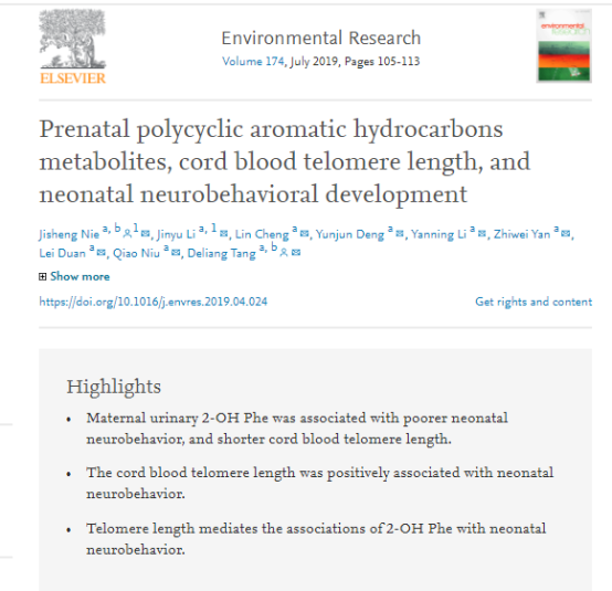 2019年4月21日,万象城allwincity官网公共卫生学院劳动卫生教研室聂继盛课题组在Environmental Research上发表了题为”Prenatal polycyclic aromatic hydrocarbons metabolites, cord blood telomere length, and neonatal neurobehavioral development”的研究成果。