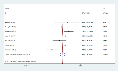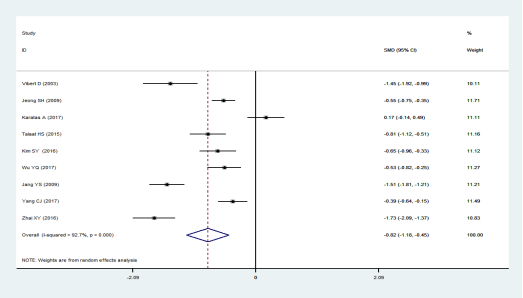 研究通过计算机检索PubMed、EMBASE、Cochrane library、ScienceDirect、Web of Science、万方和中国学术期刊全文数据库(CNKI),收集国内外有关BPPV与骨密度关系的文献共286,按照纳入排除标准最终纳11篇文献。两名研究者对最终纳入标准文献进行相关数据提取和文献质量评价。研究使用Stata软件对数据进行Meta分析,并根据可能产生异质性的因素进行亚组分析。采用Egger’s和Begg’s检验评估发表偏倚,采用逐一剔除法进行敏感性分析,评估研究结果的稳定性。结果表明BPPV患者骨质疏松和低骨量的发生风险均明显高于无BPPV的对照组(如图1、2),BPPV患者骨密度T值明显低于无BPPV的对照组(如图3),研究结果稳健、可信且不存在发表偏倚。进一步亚组分析发现黄种人BPPV患者发生骨质疏松或低骨量的风险更高。最终得出结论BPPV 患者更易骨密度下降患骨质疏松,尤其是在黄种人中,提示骨量下降可能是 BPPV发病的危险因素。