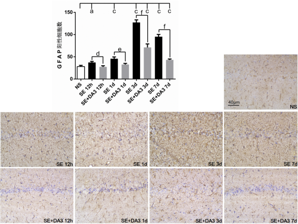 图3各组大鼠海马CA1区GFAP阳性细胞数及免疫组织化学图片(×200)
