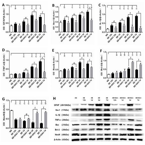 研究采用经典的匹罗卡品SE模型诱发癫痫发生,给予新型GLP-1/GIP双受体激动剂DA3-CH进行干预,通过免疫组织化学和蛋白印迹分析方法检测SE后12h、1d、3d、7d大鼠尾静脉空腹血糖水平以及海马中星形胶质细胞激活标志物胶质纤维酸性蛋白(glial fibrillary acidic protein, GFAP)、小胶质细胞激活标志物离子钙接头分子-1(ionized calcium-binding adaptor molecule-1, Iba-1)、促炎因子白细胞介素-1β(interleukin-1β, IL-β)和肿瘤坏死因子-α(tumor necrosis factor-α, TNF-α)、凋亡相关蛋白Bax和Bcl-2、神经元核抗原NeuN(neuronal nuclei)的表达水平,评估DA3-CH对大鼠SE后神经炎症反应、细胞凋亡和神经元丢失的影响。研究结果表明,DA3-CH干预对非糖尿病大鼠血糖水平无影响(图2),且可抑制SE后GFAP、Iba-1、IL-1β、TNF-α、Bax的表达,同时促进SE后Bcl-2、NeuN的表达(图3-6)。研究结果表明,新型GLP-1/GIP 双受体激动剂 DA3-CH 可抑制匹罗卡品诱导的大鼠SE后神经炎症反应、细胞凋亡和神经元丢失,具有抑制癫痫发生的潜在神经保护作用,可能为探索抑制癫痫发生的新型治疗策略提供实验基础。