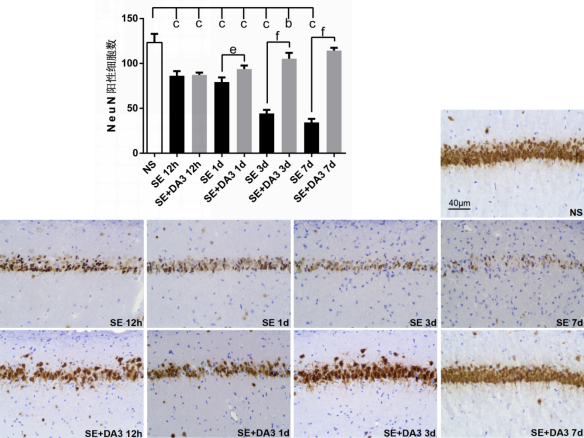 图5各组大鼠海马CA1区NeuN阳性细胞数及免疫组织化学图片(×200)